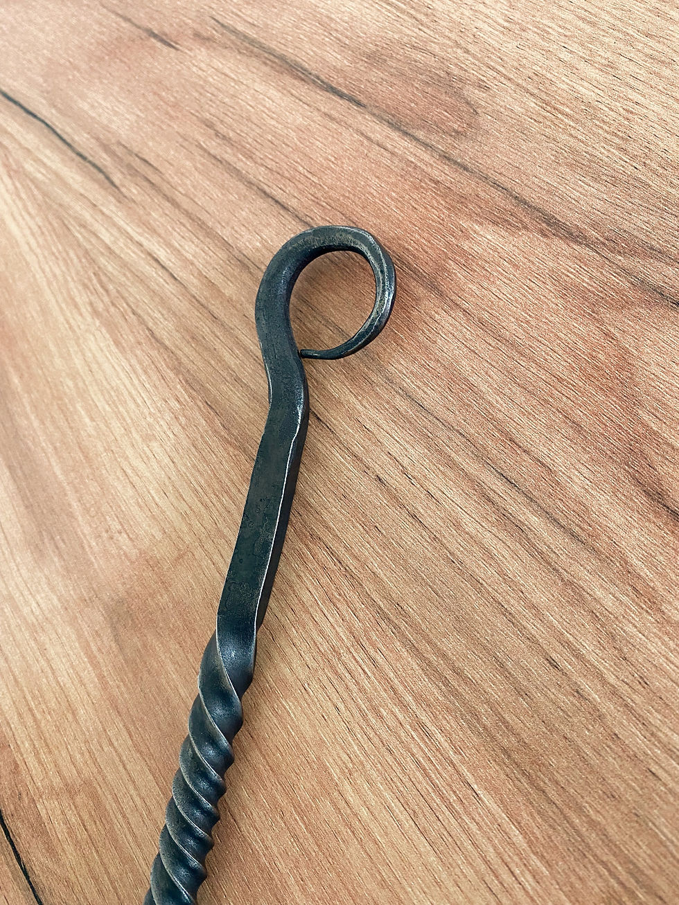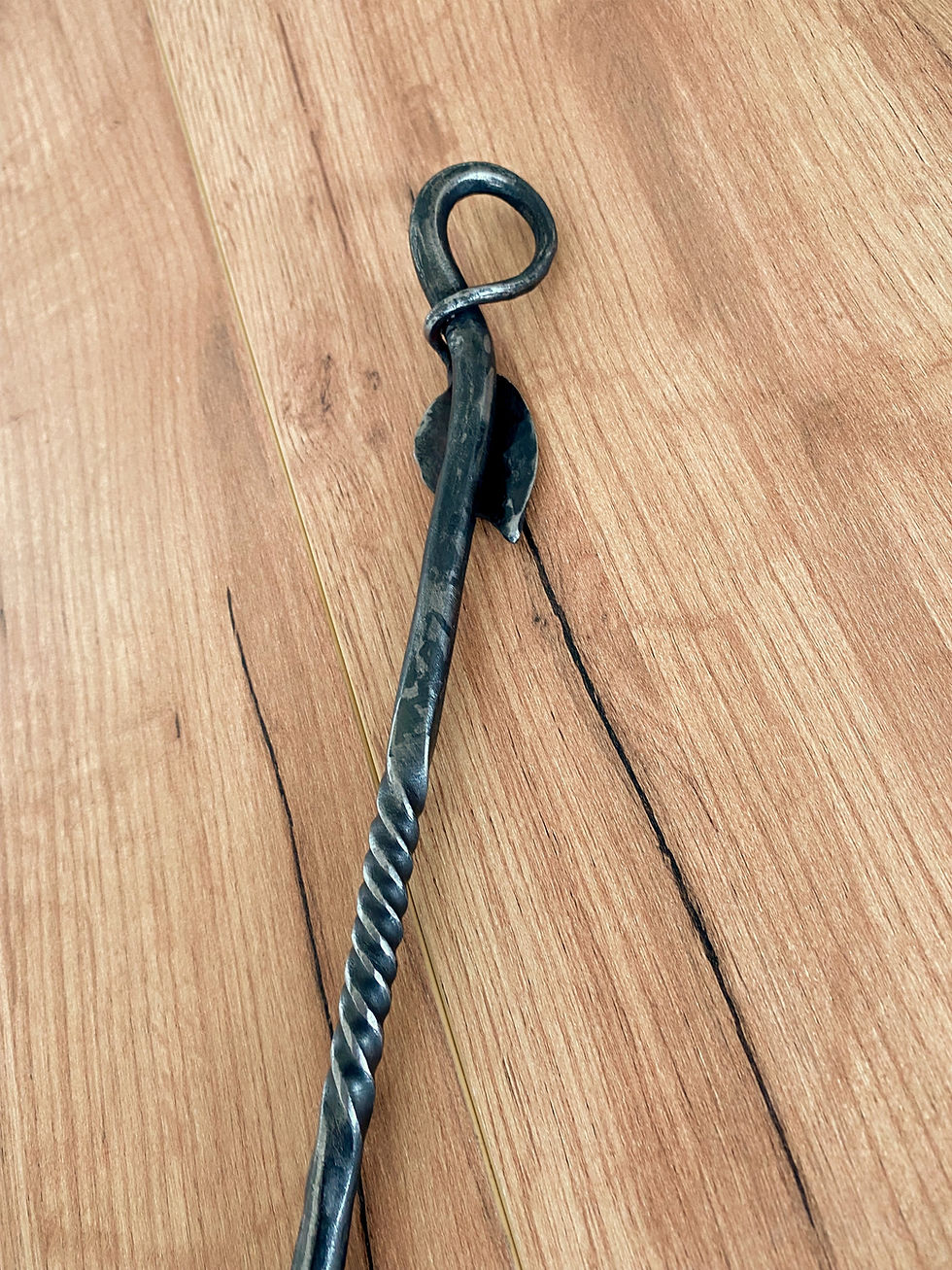Hot forged traditional fire poker with twist and leaf detail.