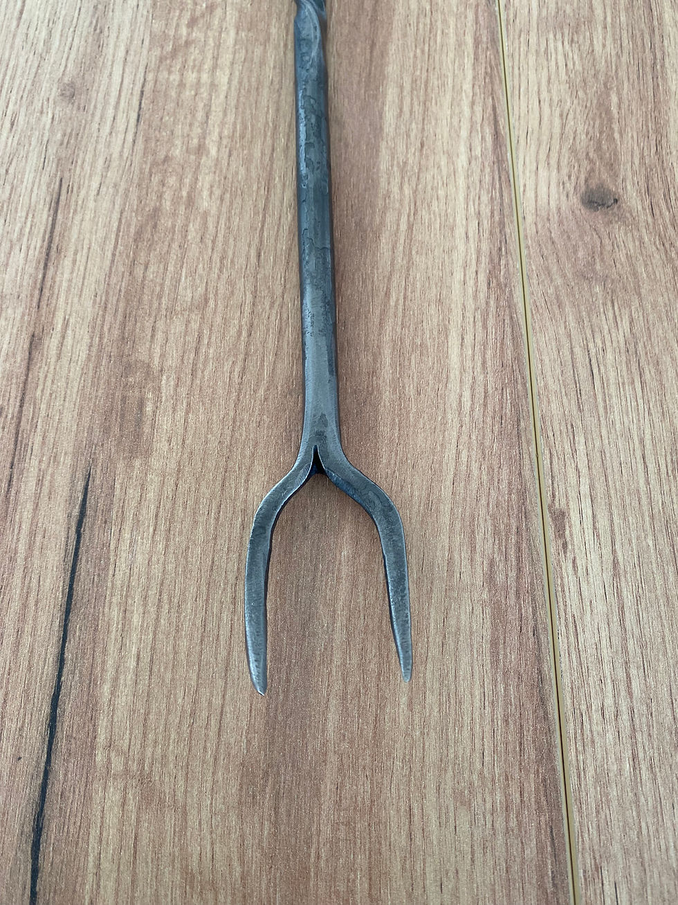 Hand forged toasting fork with leaf detail and twist.